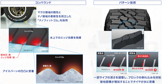 ベースコンパウンドには、「ナノフィットゴム」を採用し、マクロレベルでは剛性を保ちつつ氷上でのエッジ効果を発揮、ナノレベルではゴムの柔軟性を発揮しアイスバーンの凹凸に密着する。またパターン技術おいても、一部サイプの深さを最適化しブロックの倒れ込みを抑制することで、接地面積が増えタイヤが氷にしっかり密着する。
