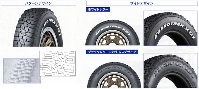 この「GRANDTREK XS1」は、夏タイヤに比べデザイン面で選択肢が限られるスタッドレスタイヤ市場において、冬でもカスタムやドレスアップを楽しみたいというユーザーの声を受けて誕生した。ブロック形状の大きなパターンに加え、スタイリッシュなホワイトレターとアグレッシブなブラックレター・バットレスデザイン(パターンデザインとブラックレターの間)の両側が、異なるサイドデザインを採用している。