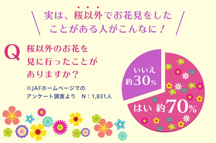 1月末~2月末までJAFご当地情報サイト上でおこなったアンケートの項目「桜以外のお花見をしたことがありますか?」に対して、約70%の方が「はい」と回答。3月下旬から5月上旬は、桜以外の多くのお花も見ごろを迎えることから、そのさまざまなお花を見に、知られざる地元のスポットへ足を運んでいただきたいと思い全国の“お花スポット”を魅力ある写真とともに届けることにした。