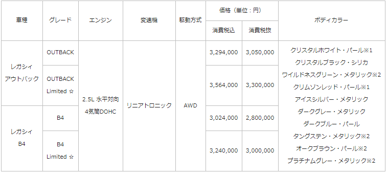 *3: アウトバックのうち、グレード「OUTBACK」のみ