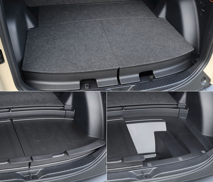 ラゲッジフロアにはリバーシブルタイプのデッキを採用。ハイデッキ状態ではラゲッジをフラットに使え、ローデッキ状態にするとそこをトレイとしても活用できる。また、デッキ下には、大型デッキアンダートレイ(ハイブリッドは右側のみ)が設けられている。汚れた物、濡れた物などを収納しておくのに便利。
