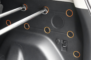 ラゲッジルームの左右にそれぞれ9つずつのユーティリティーホールが用意された。システムバーとユーティリティフック(オプション)を組み合わせることで、いろいろな仕切りや支えとしてラゲッジルームをアレンジできる。AC100V電源もオプション設定されている。