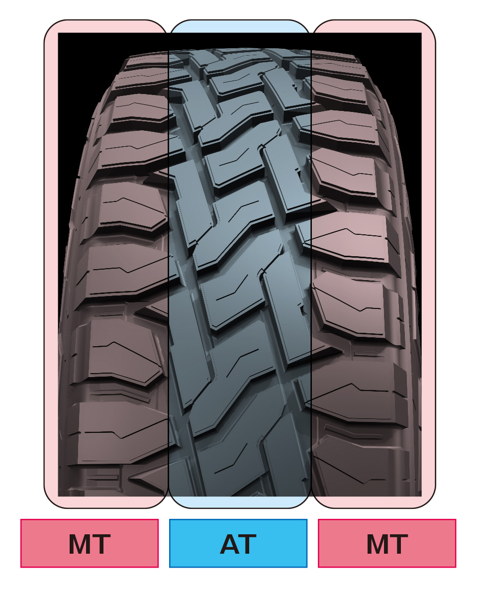 トレッドパターンは、イラストで示されているとおり、左右両端およびショルダー部分に強力なトラクションを生むM/Tタイプのラグパターン・ブロックを配置し、中央部分には回転方向の剛性を高めたA/TタイプのL字型連結ブロックを配置、という“ハイブリッドデザイン”を採用。見た目の印象としては、ショルダー部の溝面積が大きくセルフクリーニング性が高そうで、サイプが少なめのブロックは剛性も高そうだ。