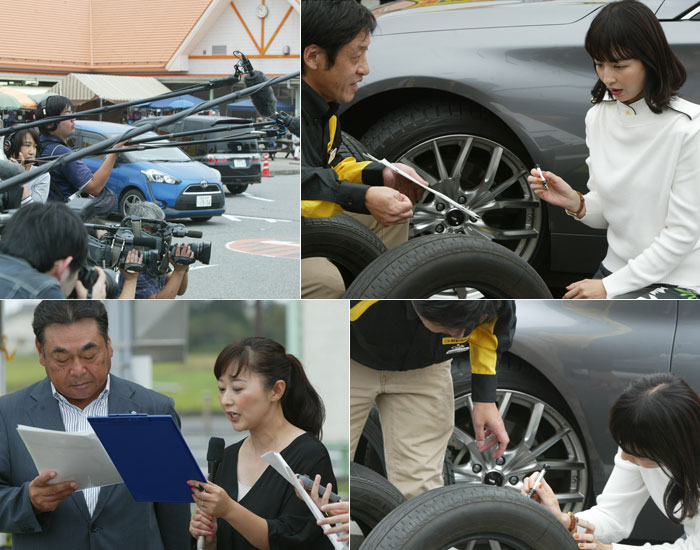 平井理央さんへのタイヤ点検レクチャーの風景(写真:右上下段)。そしてこの模様は、民放テレビ各局にて放映され、さらにはニッポン放送「LOVE&MELODY」(生放送)やTOKYO FM「ダンロップみらい図鑑」のラジオ収録も行なわれた(写真:左上下段)。