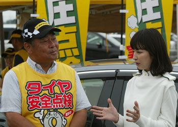 ここ「道の駅アグリパークゆめすぎと」(埼玉県)では、スペシャルゲストに平井理央さん(写真:右)を迎え「タイヤ安全点検」活動が行なわれた。そして(写真:左)は、住友ゴム工業株式会社執行役員増田氏。平井さんとの会話を通して、タイヤ点検の大切さを解りやすく伝えて頂いた。
