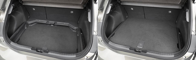 4:2:4分割アジャスタブルデッキボード(メーカーオプション)は上段・下段の2パターンに設置することで利便性を高めてくれるアイテムだが、さらにボード部を持ち上げることでラゲッジルームを縦方向に4:2:4分割して使うことも可能。