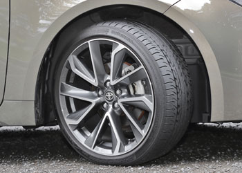 Zグレードに標準装備されるタイヤサイズは225/40R18。アルミホイールは切削光輝+ダークグレーメタリック塗装を施した、最上級モデルに相応しいテイスト。このタイヤサイズを選ぶなら(つまりZグレードを選ぶなら)AVSは是非とも組み合わせたいオプション。