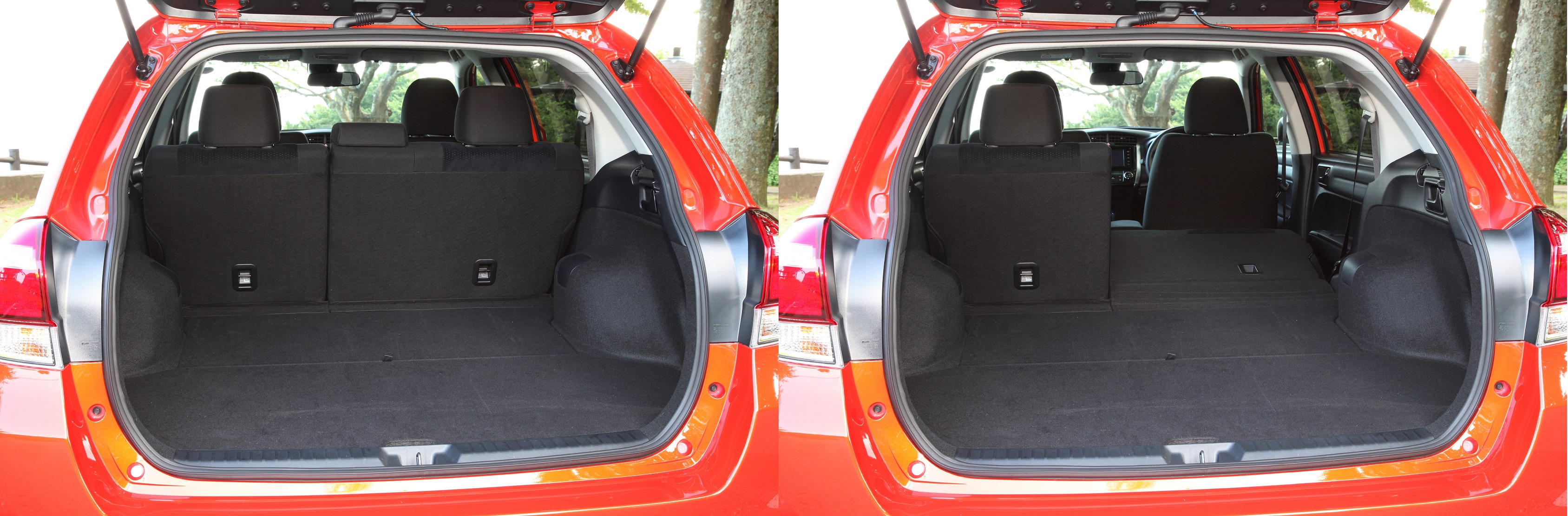リアシートは4:6分割可倒式を採用しており、片側だけ倒すアレンジも可能。その奥行きは最大で2025mm、リアシートをともに倒すと容量は872Lとなる(写真右)。