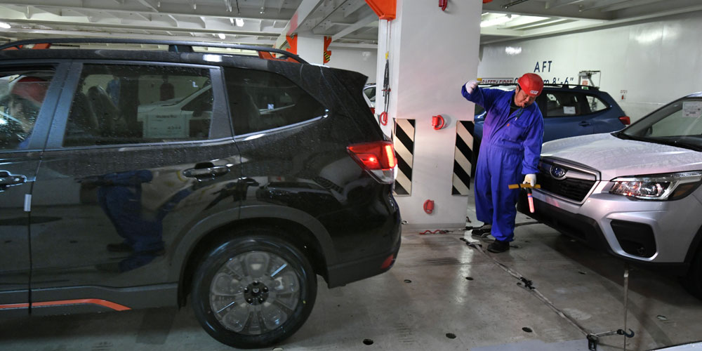 完成車両の運搬に使われる専用船を見学する機会を得たが、長さ約190m、幅約32mの船内は11層ものデッキをもち、小型車ならば約5000台、フォレスターの場合は約3000台を載せることが可能だという。その積み込みは人の手(ドライビング)によって行われ、車両間隔前後で30cm、左右で10cmと、まさに隙間がなく積み込まれて行く。