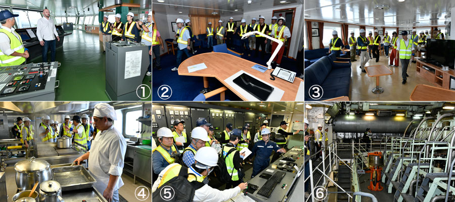 ①操舵室にて。この船のキャプテン(船長)から、直接ご説明をいただいた。