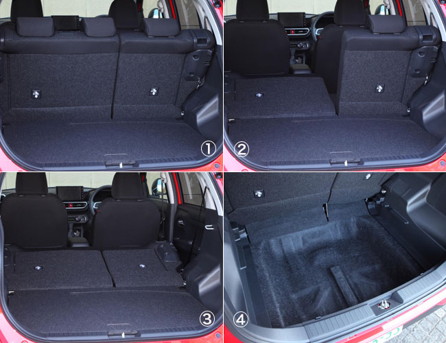 60:40分割可倒式のリアシート。最大荷室長755mm、荷室容量369リッターを誇るリアカーゴルーム(写真①〜③)。