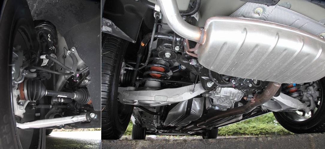 20160918susフロント:ストラット(左)、リア:マルチリンク+コイル(右)のサスペンション。ショックアブソーバーには減衰力自動調整機構が備わる。「プレミアム」にはスポーツサスが標準装備。