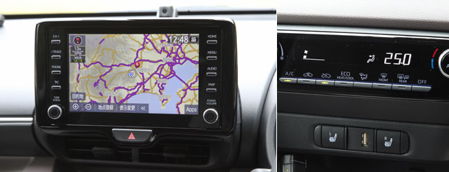 全グレードにスピーカー付きとなるディスプレイオーディオを標準装備。ディーラーオプションとしてT-Connectナビキット(11万円・税込)とエントリーナビキット(6.6万円・税込)を、また、スマホ(Apple CarPlay、Android Auto)との連携機能(3.3万円・税込)を設定。