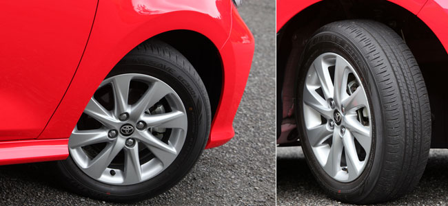撮影車両はメーカーオプションとなる185/60R15サイズのタイヤとアルミホイールを装着。ちなみに、Gに標準装備されるタイヤサイズは175/70R14で、スチールホイールが組み合わされている。