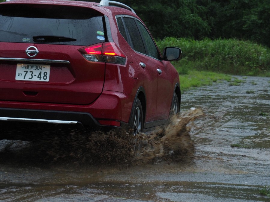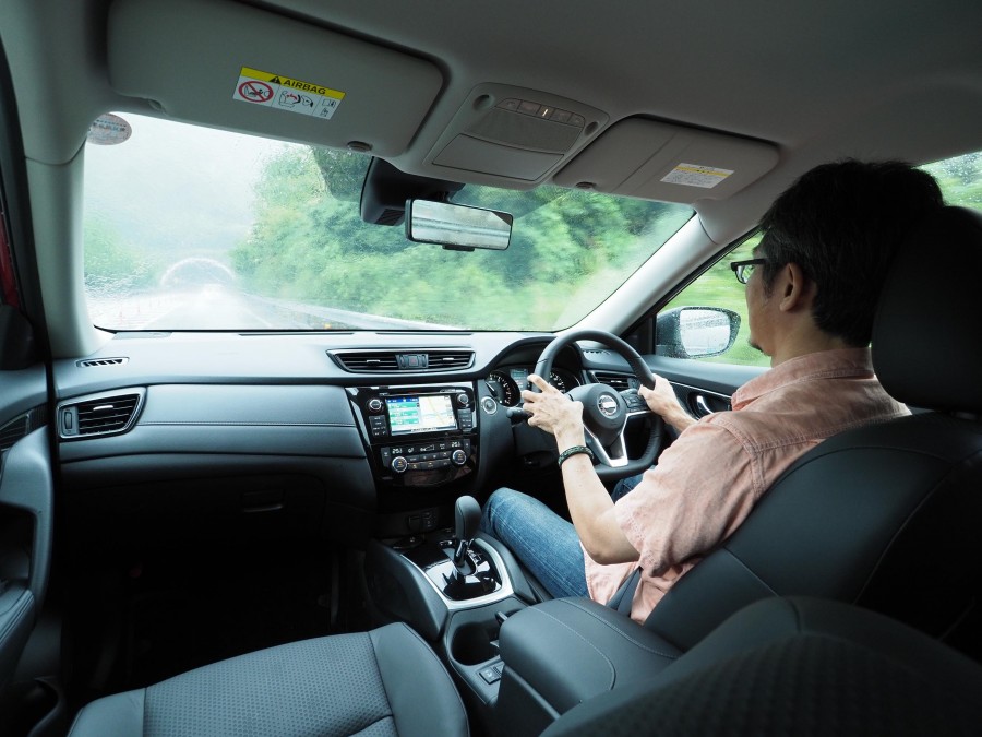 写真撮影には最悪の条件とはなったものの、もともと“苛酷な条件下でもタフな走り”をアピールしてきたエクストレイルの試乗には、まさに好都合…ということで、横殴りの雨の中、車内に駆け込み、さっそくガソリン車から試乗開始だ。