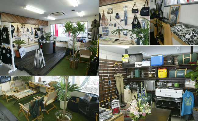 「クルマアソビコンセプトパーク」店内には、アウトドアギアを展示。フィッシングツールブランド「SOULS」のギア(写真上段)は、販売されている。一方、キャンプ道具やクッキング用品(写真下段)は、レンタル。これならキャンプ道具を持ち込む煩わしさもなく、気軽に東北のアウトドアが楽しめる。