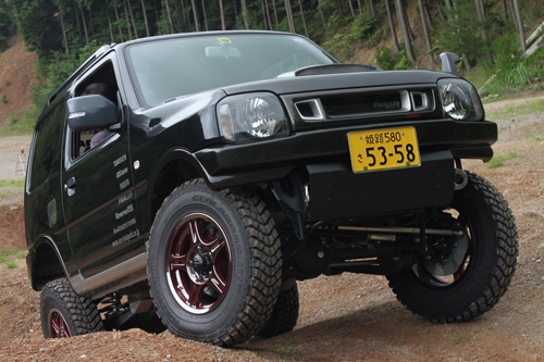 谷口社長:「現在はこれまでの歴代ジムニーやJB23用パーツに加えて、JB33&43用パーツの開発に力を注いでいます。アースチューニング キットやコンペティションマフラーⅢ、ショックアブソーバーや補正パーツなどのサスペンションは既に適合していますし、現在、FRPフロント&リアバン パーなどのエクステリアパーツは鋭意制作中。新3インチアップコイルはたった今、試作品ができあがってきたところです。期待してください!