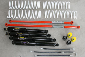 パーフェクションコイルLightキット。キット内容は、パーフェクションコイル-Light、MONROEサムライ(ショック)、ラテラルロッド前後、ミラクルキャスター、キャスターブッシュ、ロングブレーキホース、リヤショックボルト。※純正スタビ流用の場合は、スタビ延長ブロックセットが別途必要。