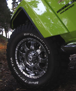 イメージはひと昔前のジープ。今は何かとマットカラーが流行っているが、僕が目指したのはオールド・スクールジープ。マイルドなリフトアップを施したボ ディに、マットではなくキラキラと輝くクロームパーツをあしらったたスタイルだ。30代半ばの僕がクルマに興味を持ち始めた幼少の頃、「カコイイ~!」と 心奪われていたジープ達は、マイルドなリフトアップにマッド系のオフロードタイヤ、そしてクロームパーツをボディ各所に装着していたものだ。マットカラー 全盛の今敢えて、自分が憧れていたスタイルを創りだして見たというワケ。そして、クルマの性格付けのみならず、スタイルの方向性を決める上で重要なパーツ のひとつであるタイヤは、BFグッドリッチのマッドテレインT/A KM2をチョイスした。サイドウォールで存在感を発揮しているホワイトレターもオールド・スクールジープには欠かせない存在だし、さらに、近頃現行へとモ デルチェンジを果たしたマッドテレインのデザインがカッコイイのだ。聞くとろこによると、トレッドのデザイン云々というよりも、ゴツゴツした路面への食い つきを考慮した結果、この形に仕上がったとのことだったが、オンロードでの静粛性やグリップにも何ら問題なく、ブロックが大きい見た目のイメージよりも、 かなり扱いやすいタイヤだったのは嬉しい誤算だ。