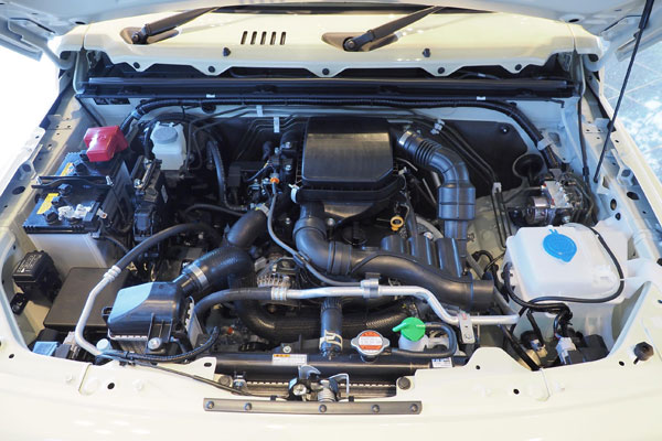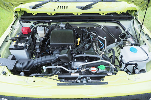ジムニー660は、R06A型直3-DOHCガソリンターボを搭載。最大出力47kW/6,000rpm、最大トルク96Nm/3,500rpmというスペックで、先代K6A型に較べて最大トルク値をややダウン(103→96kW)させているが、最高出力の発生回転数を下げる(6,500→6,000rpm)などして扱いやすさを重視したセッティングとした。