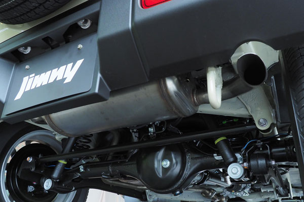 リアサスペンションも同じくコイル+リジッドアクスル式。最低地上高が先代より5mm増えて205mmとなった(シエラは10mm増えて210mm)。