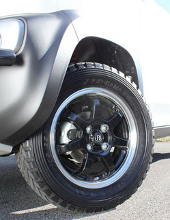 タイヤは「ジオランダーM/T+」 (185/85R16)。 ホイールはレイズとのコラボレーションで誕生した、オリジナルカラーの「A・LAP-J」が装着される。