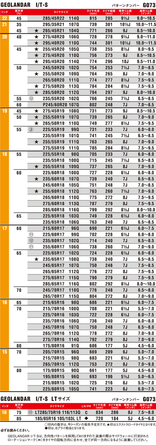 このジオランダーI/T-S、今年に入ってまたサイズバリエーションが増えた。具体的には以下の6種。これで、カタログに掲載されていないサイ ズと合わせ全部で63種類(編集部調べ)。SUV専用スタッドレスとしては圧倒のサイズバリエーションとなった。詳しくは後段にサイズ表を用意したのでご 覧いただきたい。