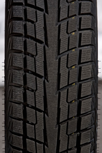 tire101026_01_091011左:重いSUVに履かせるI/T-Sならではの技術。トレッドゴムに、2層構造を新採用、表面のトリプル吸水ゴムの下に高剛性ゴムを配した。ドライ路での 剛性や氷上での接地性アップに繋がっている。中:ゴムがホイールリムを守ように盛り上がっているのがおわかりいただけるだろう。悪路を走る時にリムをガー ドする「リムガード」を全サイズに採用。SUV用スタッドレスとして細かいところにまで気を配っている。右:複雑な立体サイプが互いに支え合い、ブロック 剛性を向上させるトリプルピラミッドサイプ(右)を小さなブロックに採用。剛性の高い中央リブには旧来のピラミッドサイプ(左)を配置する。トレッド全体 の剛性とグリップ力を均一化させ偏摩耗も防ぐ。