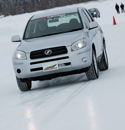 tire101026_01_013旭川のテストコースで行ったアイスバーンのテスト。スケートリンクのようにツルツルの路面で、新型IT-Sは旧型より格段に向上した減速感が体験できた。 速度計の目視に頼る取材班は制動開始スピードを正確に合わせることができなかったが、実は正しい実験結果がある。ヨコハマタイヤの公正取引協議会届け値に よれば、RAV4による40km/hからの制動比較で旧型の81.4mに対し新型は52.6m、約30%マイナスの数値を記録した(気温−1.2〜 −1.8℃、氷温−2.6℃)。パニック時に、この違いは大きい。