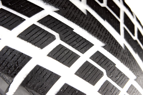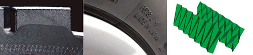 tire101026_01_0708左:稲妻状に配された中央の極太リブに注目。接地面積とサイプ量のアップを実現したほか、テーパー状の溝壁面で剛性を確保、ジグザグ形状のブロックエッジ で雪を噛むという。実によく考えられたデザイン。右:トレッドブロックのカタチ、というより溝の形状をジグザグに成形。エッジを飛躍的に増やしている。ま た、ブロック壁面の溝をテーパー形状にすることで剛性も増しているという。
