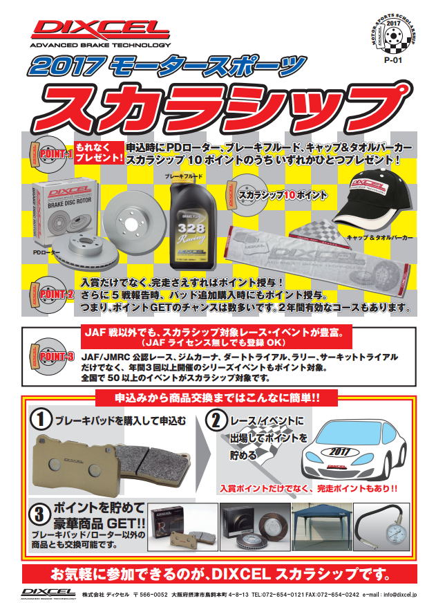 また入賞だけでなく、「完走ポイント」、「5戦報告ボーナスポイント」、「パッド追加購入ポイント」を設定しており、ENJOY派の方にもポイントを獲得するチャンスがあり、貯めたポイントでブレーキパッド/ローター、グッズ、走行会での備品などと交換可能。