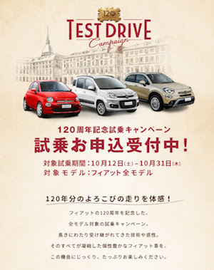 「120年分のよろこびの走りを体感!」と題したキャンペーンは、フィアット全モデルを対象とした試乗キャンペーン。