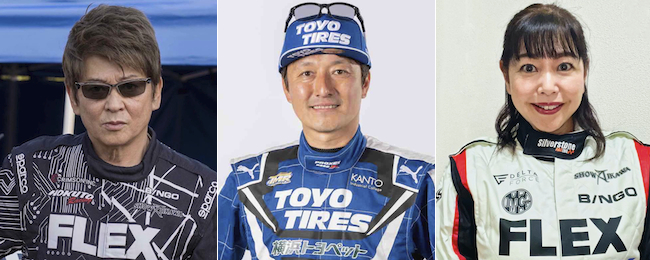 (写真左から)監督:哀川 翔氏/1号車ドライバー:川畑真人 選手/2号車ドライバー:竹岡 圭選手