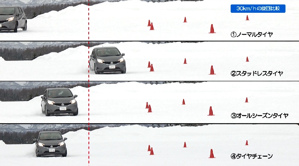 テスト結果は、写真の通りで、スタッドレスタイヤは、 40km/hまでパイロンから極端に離れず、安定して走ることができたが、ノーマルタイヤは、 30km/hでパイロンに沿って走ることができず、大きく走行ラインが膨らんた。また、チェーン装着車は、前輪と後輪のグリップバランスの差が大きく、 30km/hで急に後輪が滑り出し、前輪を軸にスピンしてした。
