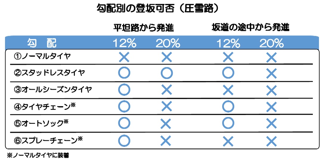 [資料編] 雪道での登坂テスト: http://www.jaf.or.jp/eco-safety/safety/usertest/tire/detail3_1.htm