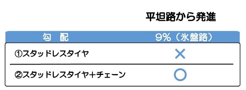 また、勾配9%の氷盤路では、アイスバーンと呼ばれる滑りやすい路面だったため、スタッドレスタイヤでも上れませんでしたが、スタッドレスタイヤにチェーンを装着すると、坂道を上ることができた。