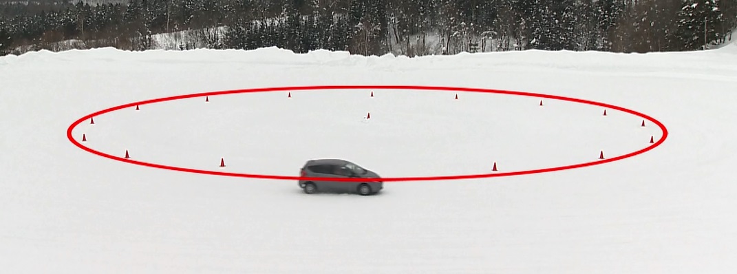 「旋回テスト」の実験では、前輪駆動のコンパクトカー※4を使用して圧雪路の円周コース(半径20m)を15km/hから周回し、速度を5km/hずつ上げ、カーブに沿って曲がれるか、車の挙動を4種類のタイヤ※5で検証した※6。
