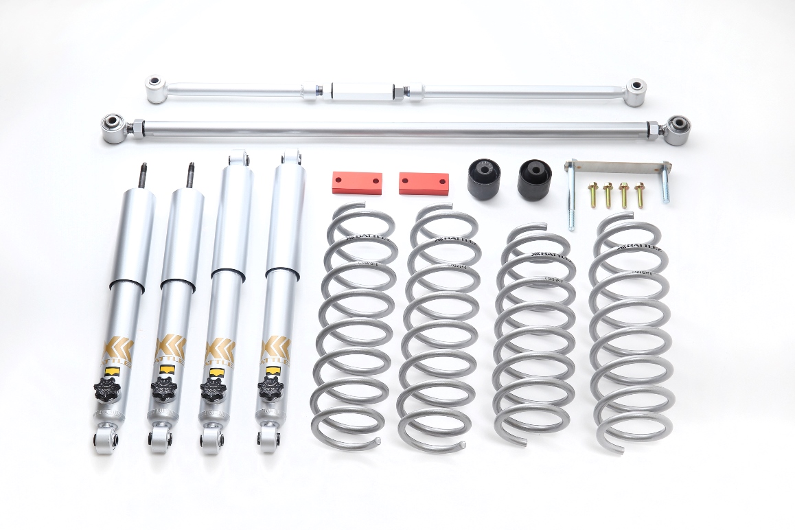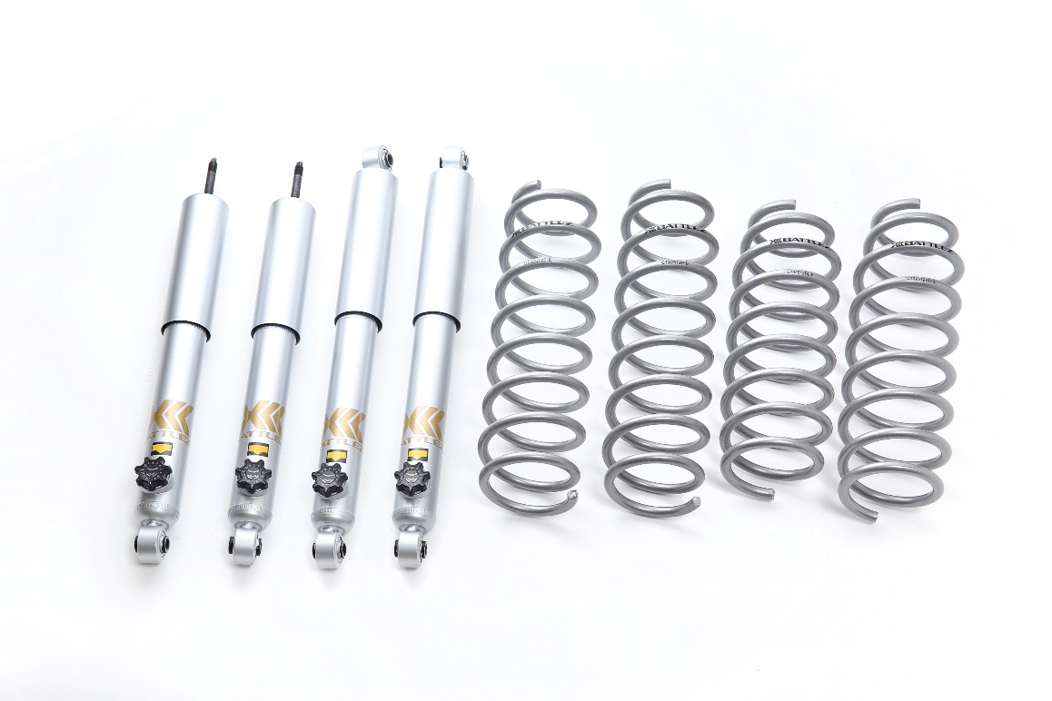 「BATTLEZ SUS set AJ」 シリーズは減衰力を気軽に調整できる14段ダイヤル調整式ショックアブソーバー とジムニー(JB23)用、ジムニーワイドとシエラ(JB33/43)用それぞれ専用に開発したチタン配合材を使用したヘタリ保証付きのコイルスプリングを組み合わせている。
