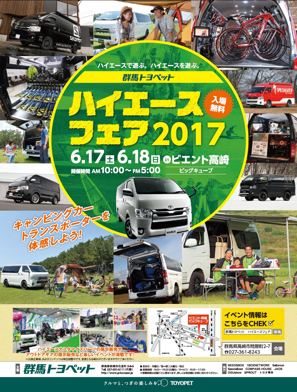 6月17日(土)、18日(日)の2日間、群馬県高崎市で群馬トヨペット主催のハイエースフェア2017が開催される。今年で4回目を迎える同フェアは内容をさらに充実。様々なスタイルにカスタムされたハイエースが展示される。中にはサロモン、スペシャライズド、コンパスハウスなど、なかなか実車を見る機会がない希少なハイエースも登場。