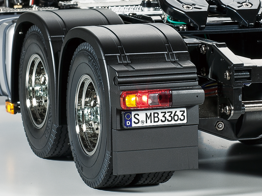 特にエンジン音は大排気量ディーゼルエンジンを搭載した実車の鼓動が音源。アイドリングから全開まで、スピードに合わせてエンジン音が変化する。加えて、エアドライヤー音やエア排気音、ブレーキ音など実車が発するほぼ全ての音を再現。また、ストップランプやウインカー、バックランプは操作にあわせて、さらにヘッドライト、フォグランプ、ハザードなどの点灯は送信機でオン・オフをコントロールできる。