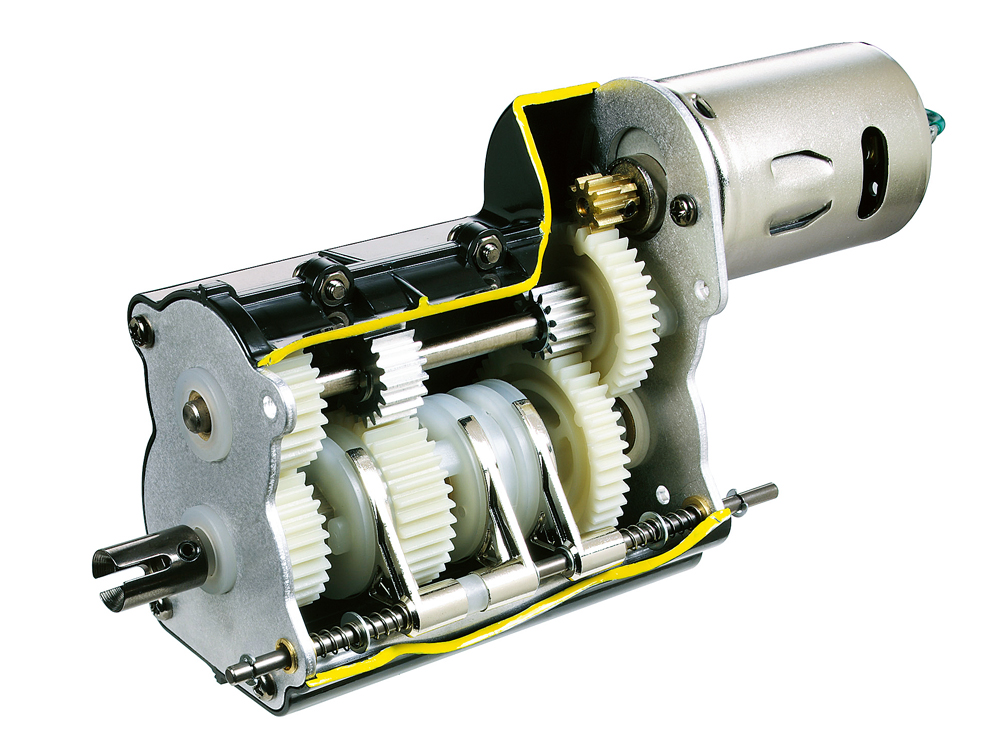 走行中にRC操作でギヤチェンジ可能な組み立て式の3速トランスミッションを搭載。
